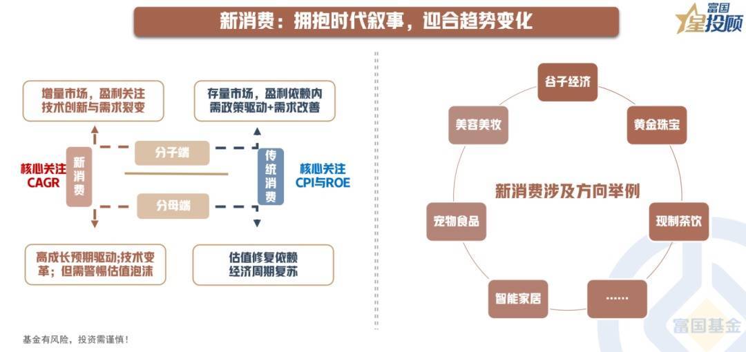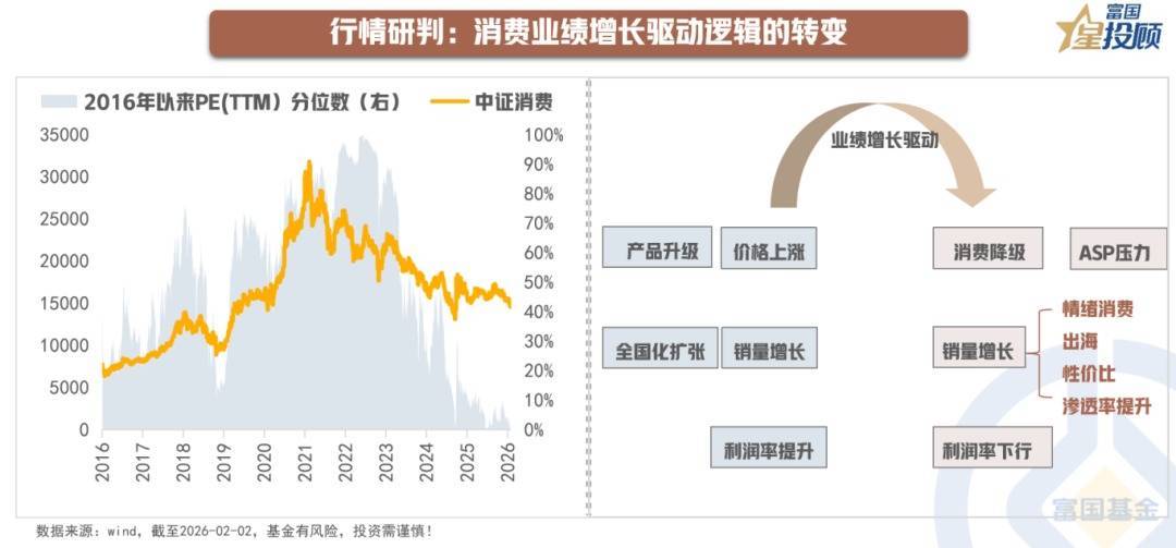 以中证800消费为例,自2021年见顶以来,指数经历了长达五年左右的深度调整,股价及估值均触及历史低位。累年下行的背后,系估值、业绩与底层增长逻辑的三重变化。其一,核心资产牛市泡沫破灭后估值的理性回归。其二,随着宏观经济环境的转变,许多消费企业财务报表开始显现疲态,形成业绩杀。其三,消费业绩增长逻辑发生变化,近年来受大环境影响,驱动传统龙头业绩增长的消费升级逻辑阶段性面临挑战,新消费则抓住情绪消费、出海、性价比等方向红利,展现出更好的成长动能,这也是近年来新老消费表现分化的内在原因。