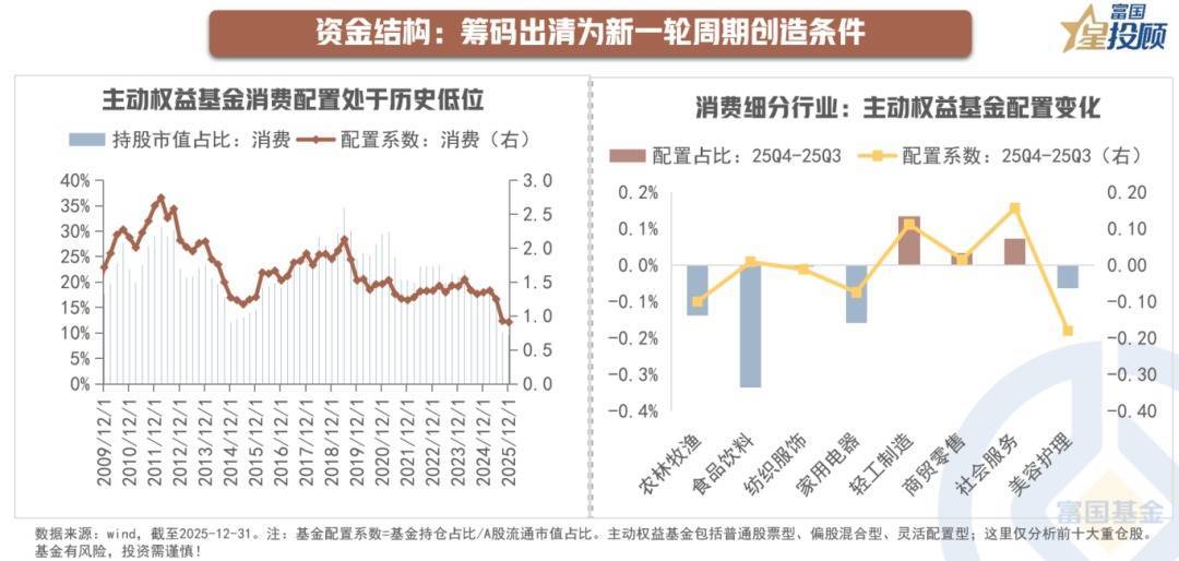 从基金四季报看,25Q4机构调仓和白酒等主要权重板块的下跌导致消费整体持仓继续下滑,主动权益持仓消费市值占比环比25Q3回落0.5pct,配置系数也略微回落,消费持仓占比和配置系数目前均在2010年以来0%的历史低位,筹码出清有望为新一轮周期创造条件。细分行业看,基金配置比例在长期下行后,于25Q4普遍呈现底部企稳的态势,除食品饮料以外的其他消费子行业持仓变化并不大,社会服务、商贸零售、轻工制造配置则不降反升。