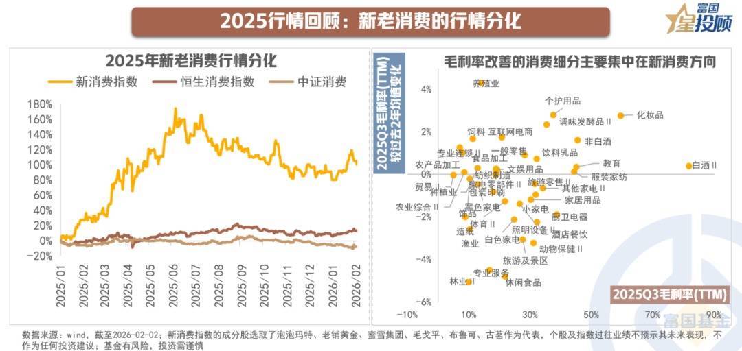 2025年新消费投资情绪经历了从狂热到理性的过程,下半年基本都处调整阶段,其它板块上涨后新消费企业的估值优势逐步凸显,随着新消费企业2026年的业绩增长指引逐渐明确,估值有望来到与盈利增速匹配的水平,今年预计仍有望收获合理的回报。长期视角看,新消费契合时代发展方向,潮玩、美妆、个护、珠宝零售等方向机会频现,商业模式好、竞争力突出、管理优异的优质公司有望成为时代的赢家。