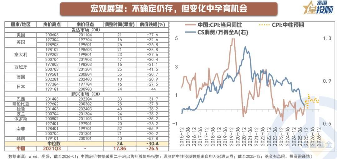 展望2026年,宏观大环境依然存在不确定性,短期来看整体消费意愿或难有显著提升,但边际的变化正在孕育消费板块的机遇。其一,房地产业调整带来的“财富”缩水是近年来拖累消费的重要因素,尽管目前来看房地产基本面反转或仍需时日,但行业深度出清叠加政策稳预期信号明确,房地产对消费的拖累或有望逐步收敛。其二,回溯历史,当CPI温和通胀且趋势向上时消费板块占优,就目前而言,虽然市场对今年物价修复水平存在分歧,但物价温和回升是市场的一致预期。若2026年实质性政策继续推出带动物价水平出现明显改善,消费板块的弹性更值得重视。在当前位置,消费板块整体处于可为的阶段,结构上新老消费表现或有收敛。