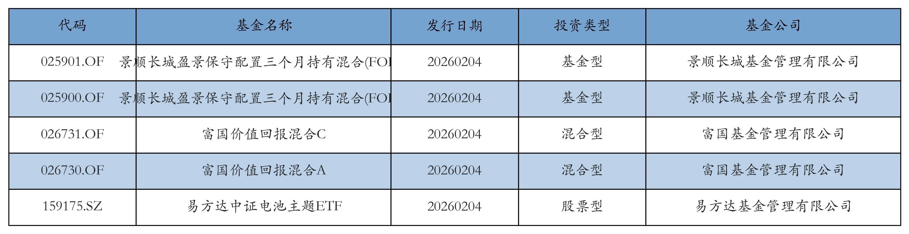 昨日有5只新基金发行,分别为:景顺长城盈景保守配置三个月持有混合(FOF)C、景顺长城盈景保守配置三个月持有混合(FOF)A、富国价值回报混合C、富国价值回报混合A、易方达中证电池主题ETF,详情见下表: