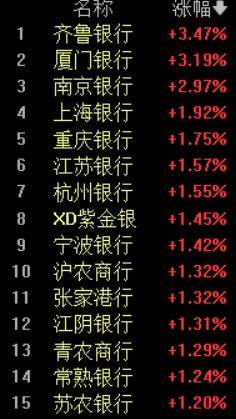 银行板块逆市走高,截至发稿板块上涨1.07%,板块内个股表现活跃,齐鲁银行、厦门银行涨超3%,重庆银行、南京银行、长沙银行等多股跟涨。