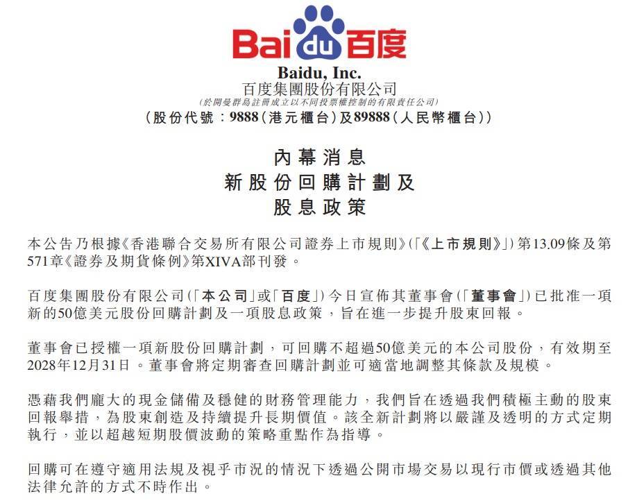 【大河财立方消息】2月5日早间,百度集团在港交所公告,董事会批准一项新的股份回购计划,授权回购不超过50亿美元的公司股份,有效期至2028年12月31日,回购可通过公开市场交易或其他合法方式进行。